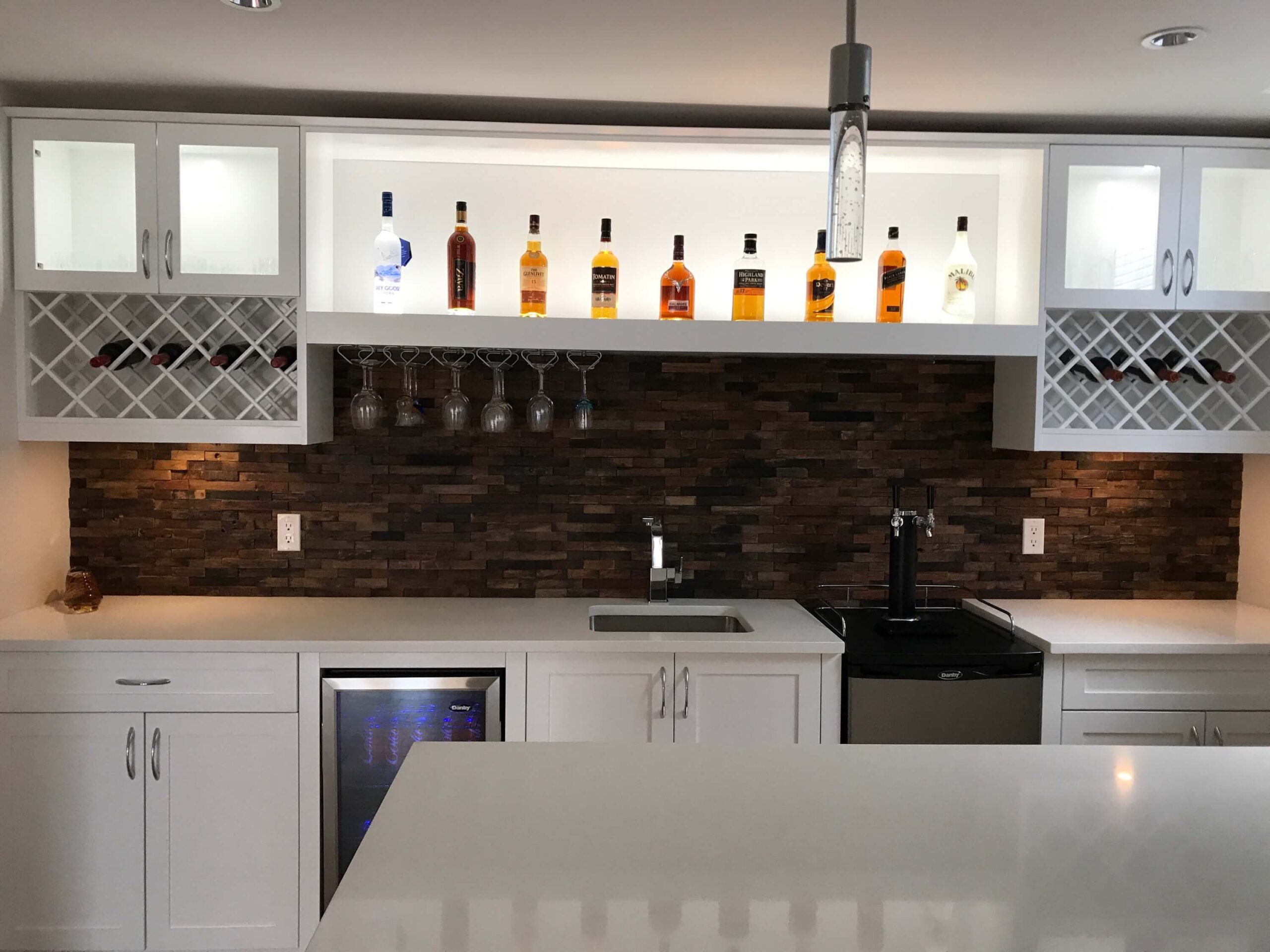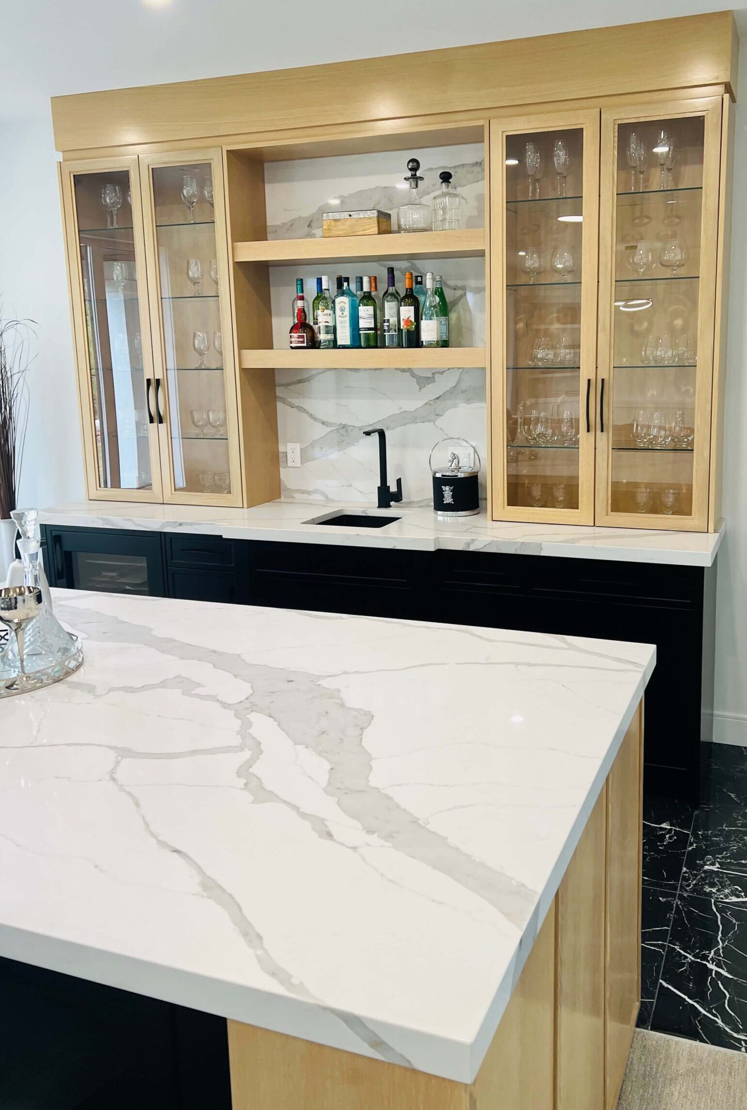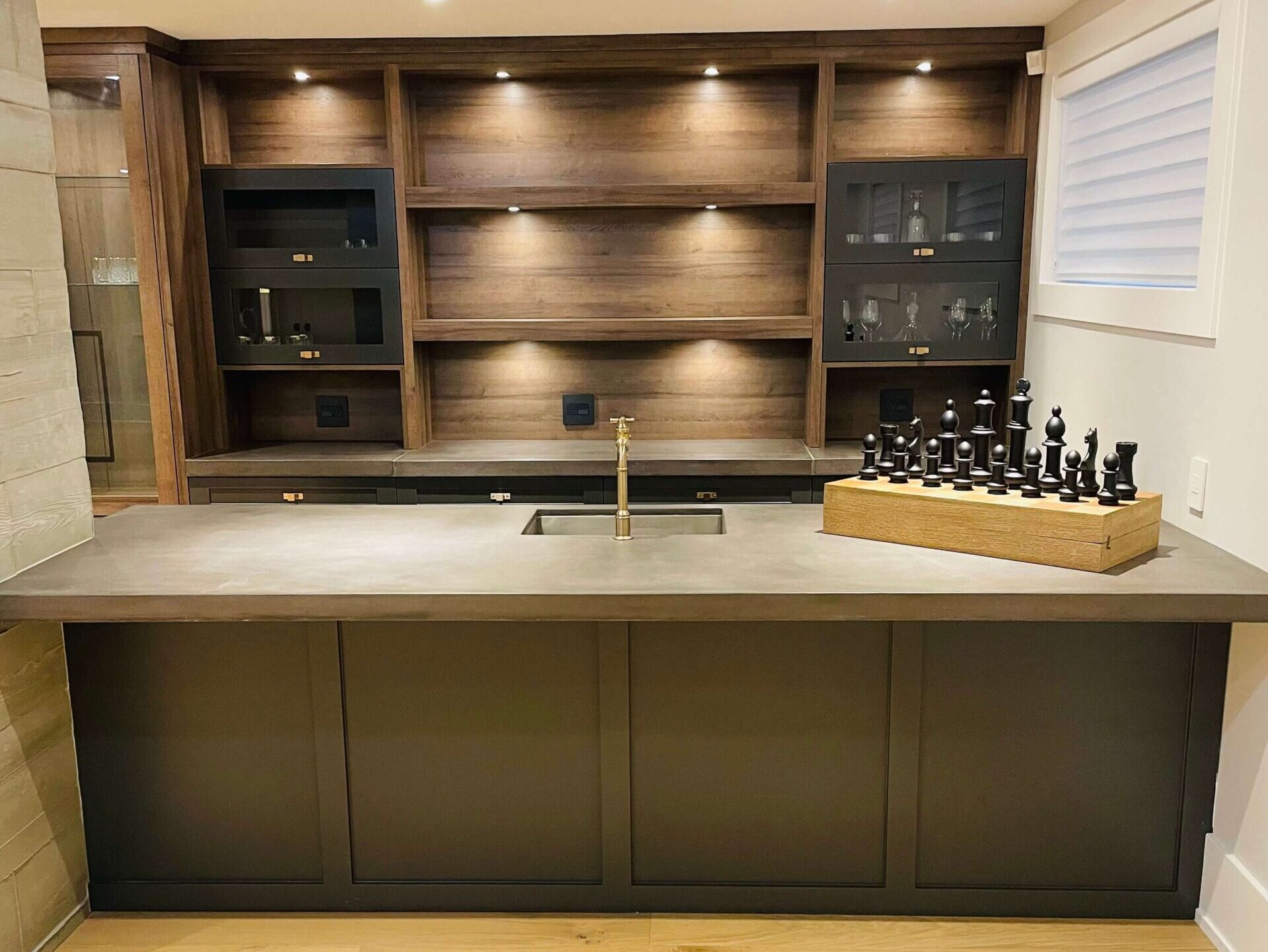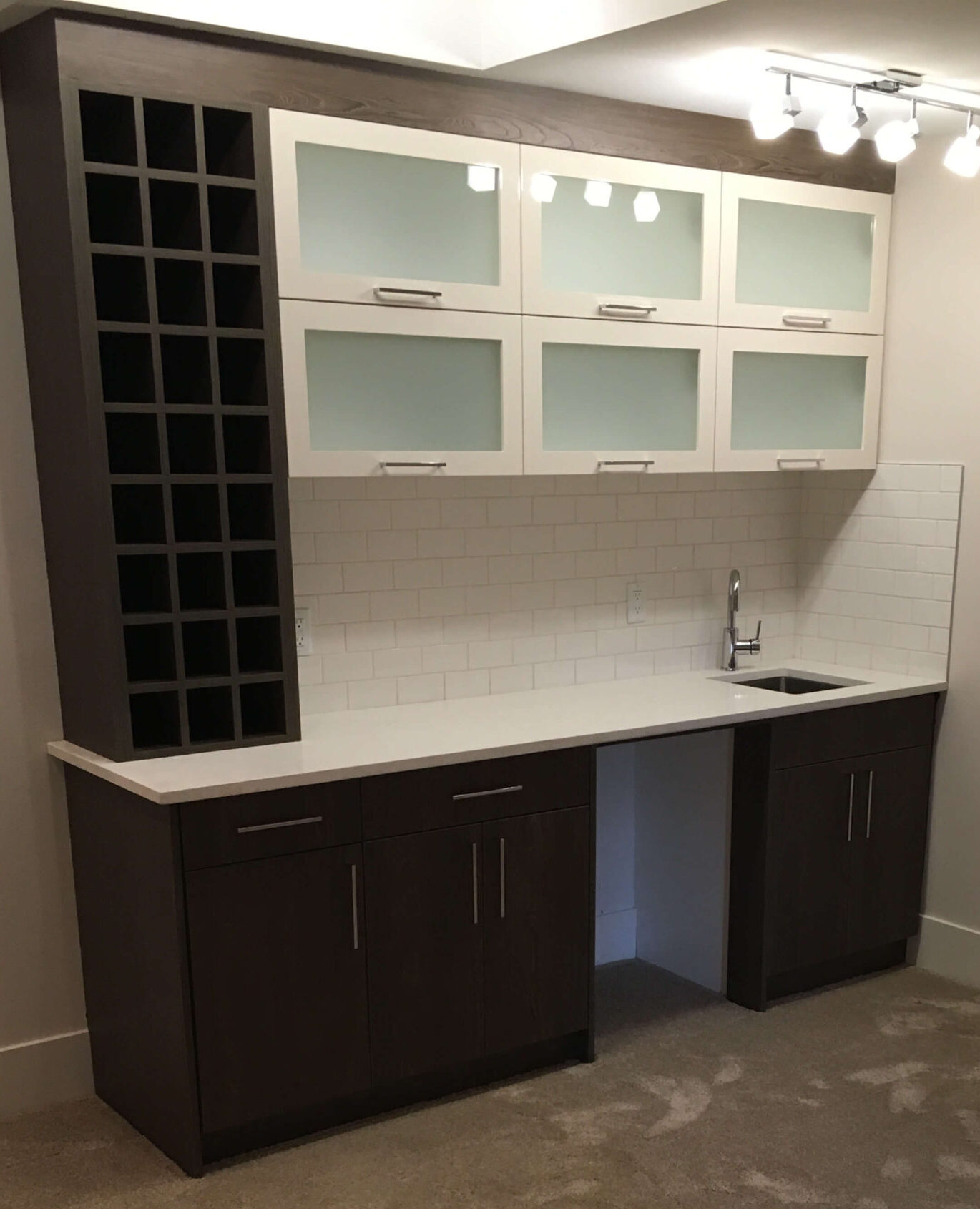 At Calgary Custom Kitchen Cabinets Ltd, we prioritize quality and durability. Our expert craftsmen use only the finest materials, ensuring that your custom bar cabinets stand the test of time. We offer a range of wood species, finishes, and countertop options, allowing you to personalize every detail. Our innovative storage solutions include built-in wine racks, glass holders, and soft-close cabinetry, making your bar not only stunning but also highly functional. From initial design consultation to final installation, our team is committed to exceeding your expectations.