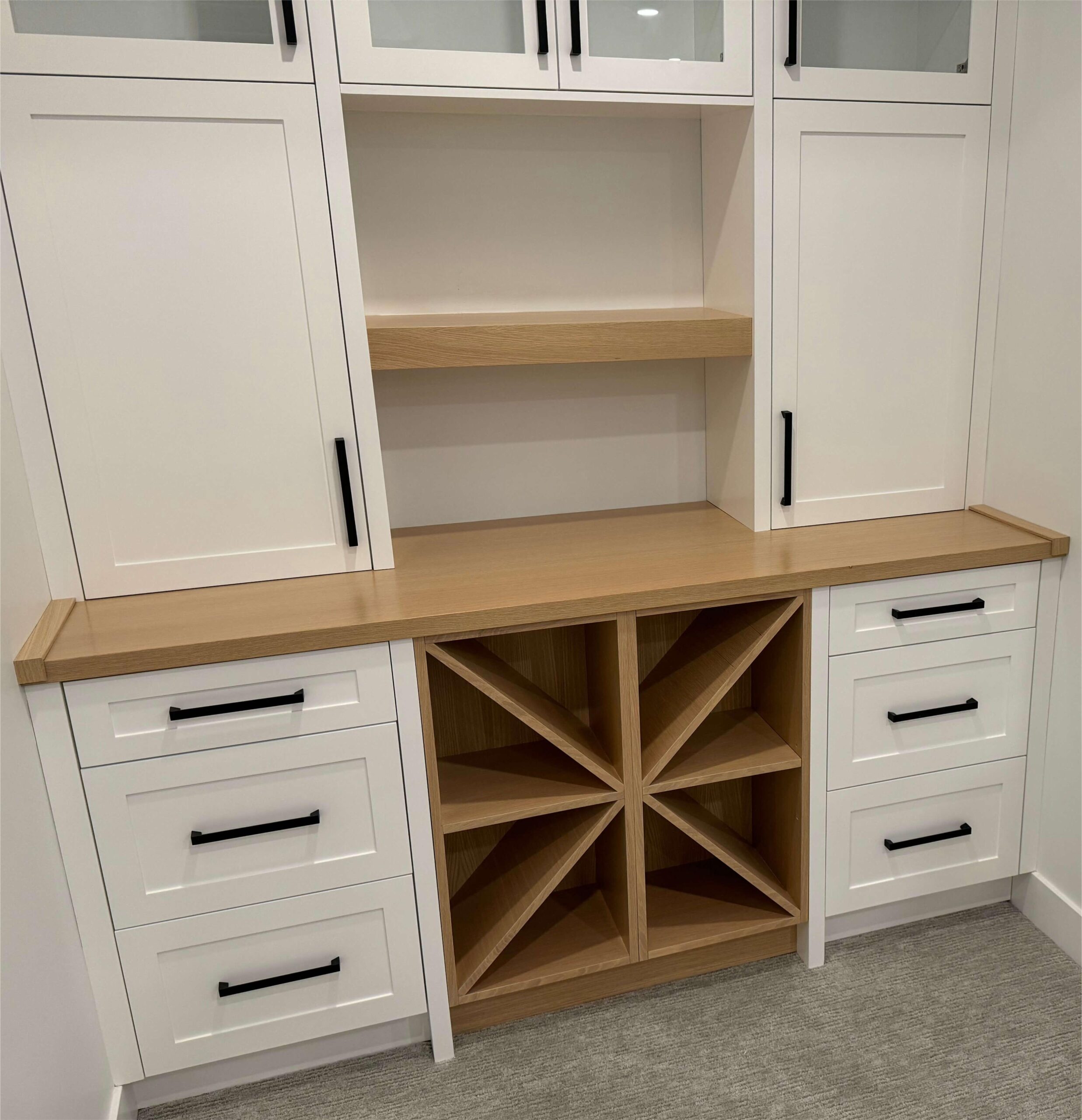 Our custom solutions ensure optimal storage for bottles, glassware, and bar essentials, making your home bar both beautiful and practical.